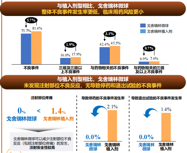 作為全球首個(gè)且唯一獲批的戈舍瑞林微球產(chǎn)品,百拓維從關(guān)鍵輔料到制劑均為我國(guó)自主研發(fā),且采用了二代乳化溶劑揮發(fā)法更新工藝,實(shí)現(xiàn)了高達(dá)90%以上的藥物包封率和批次間高穩(wěn)定性,并改善藥物的釋放效果。該產(chǎn)品打破了20多年來(lái)進(jìn)口戈舍瑞林植入劑的壟斷地位,而且沒(méi)有單純仿制早先上市、不夠先進(jìn)的微球制劑,而是選擇走劑型改良的開發(fā)策略。目前注射用戈舍瑞林微球用于前列腺癌的臨床III期研究論文已公布,從研究結(jié)果來(lái)看,注射用戈舍瑞林微球的去勢(shì)成功率與戈舍瑞林植入劑相當(dāng):該研究采用非劣效性設(shè)計(jì),治療29天時(shí)(起始治療后的第2次注射)兩組去勢(shì)患者比例分別為99.3%和100%,維持至第85天時(shí)(起始治療后第3次注射)的比例則分別為99.3%和97.8%,注射用戈舍瑞林微球療效達(dá)到非劣于戈舍瑞林植入劑的標(biāo)準(zhǔn)。在主要終點(diǎn)及其它次要終點(diǎn)表現(xiàn)相當(dāng)?shù)那闆r下,注射用戈舍瑞林微球組患者注射部位不良反應(yīng)(如疼痛、紅腫等)發(fā)生率顯著低于戈舍瑞林植入劑組(0 vs. 1.4%),證實(shí)了其改善患者治療體驗(yàn)的價(jià)值,畢竟傳統(tǒng)植入劑注射針頭有1.6毫米粗,而注射用戈舍瑞林微球針頭外徑僅為0.8毫米,改善顯而易見(jiàn);此外,研究中也未發(fā)現(xiàn)與注射用戈舍瑞林微球治療相關(guān)、并導(dǎo)致停藥和退出研究的不良事件[7]。復(fù)旦大學(xué)附屬腫瘤醫(yī)院副院長(zhǎng)、泌尿腫瘤 MDT 首席專家葉定偉教授指出,注射用戈舍瑞林微球在臨床療效和安全性與植入劑型一致,注射方式、患者體驗(yàn)更佳,為前列腺癌臨床治療提供了更多選擇。
